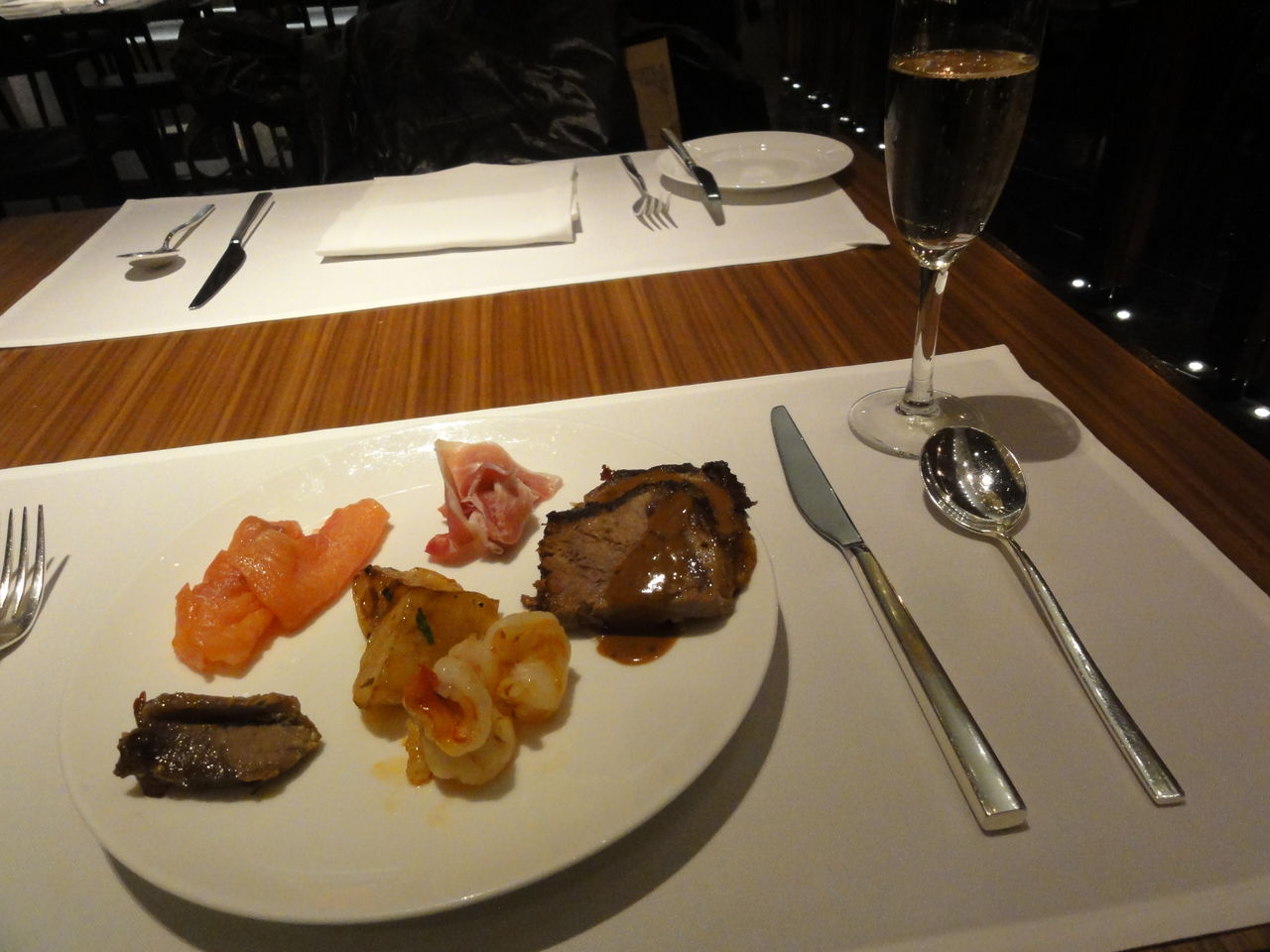 丁度、0時を回ったので、キャセイのある程度偉い位の人が、一席一席回って乾杯してた。私のところにも回ってきたのでシャンパンで乾杯する。