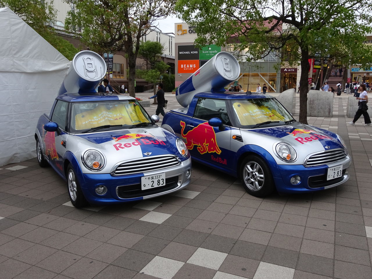 海浜幕張の駅前でレッドブルカーがお出迎え。